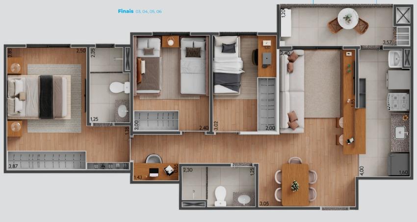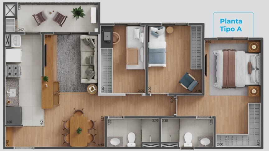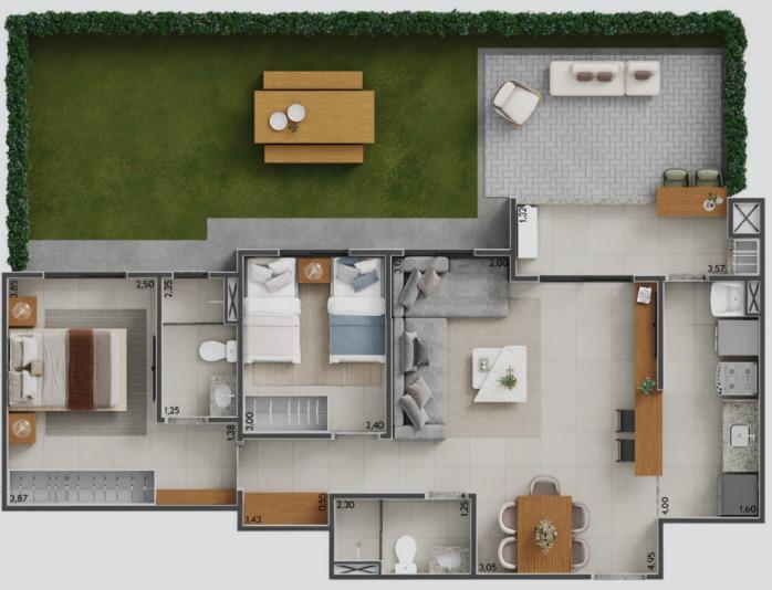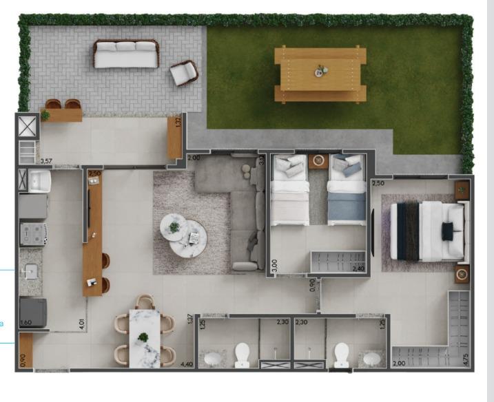 - 2 dormitórios com ampla sala e opção de pedir o terceiro quarto diminuindo a sala durante a construção, 66 mts, com suíte, varanda com churrasqueira a carvão, 1 vaga garagem.