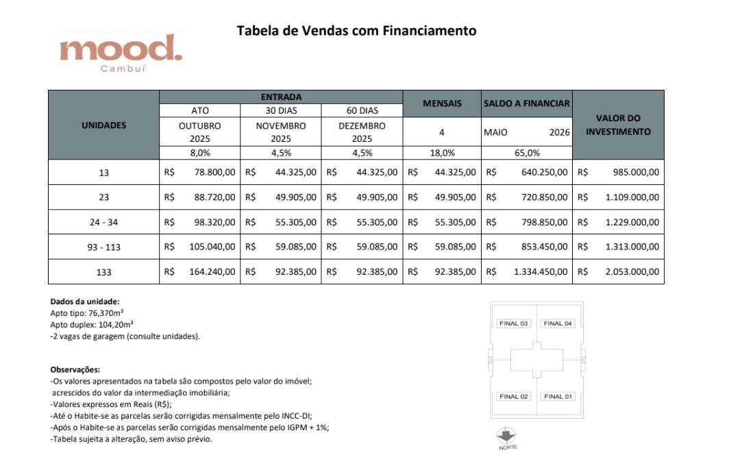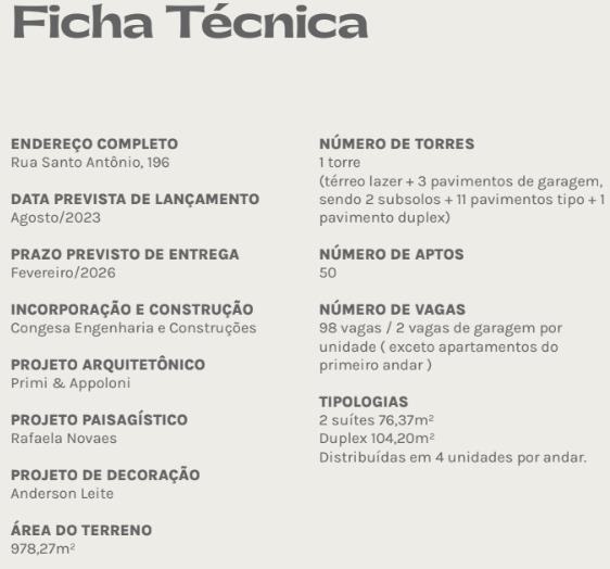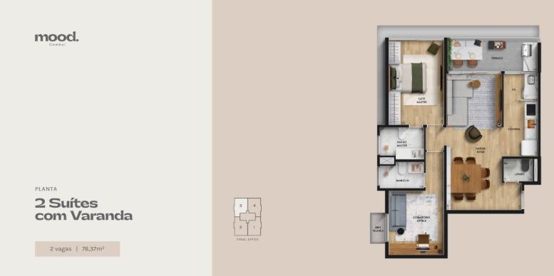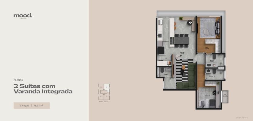 Planta tipo de 76 m² com 02 suítes e living integrado. 01 ou 02 vagas de garagens.