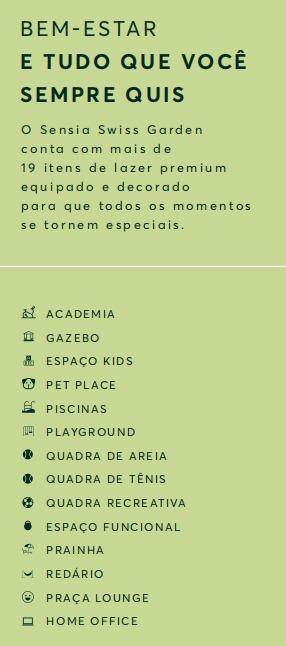 ACADEMIA, GAZEBOM ESPAÇO KIDS, PET PLACE, PISCINAS, PLAYGROUND, QUADRA DE AREIA, QUADRA DE TÊNIS, QUADRA RECREATIVA, ESPAÇO FUNCIONAL, PRAINHA, REDÁRIO, PRAÇA LOUNGE, HOME OFFICE.