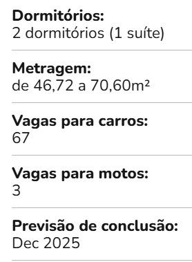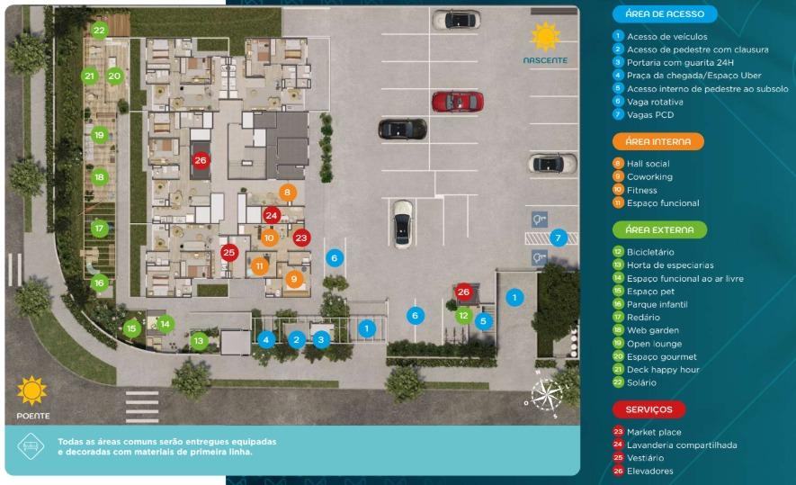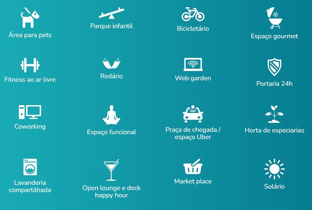 - PET PLACE, BICICLETÁRIO, REDÁRIO, COWORKING, FITNESS, ÁREA PET, MINIMERCADO, LAVANDERIA, CHURRASQUEIRA, (NÃO TEM PISCINA).