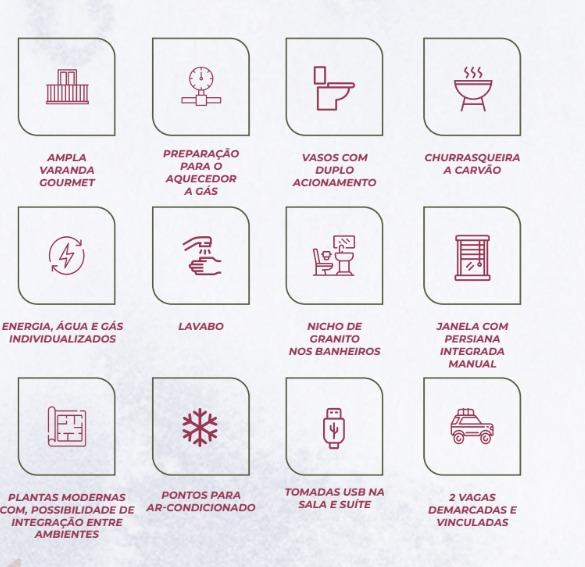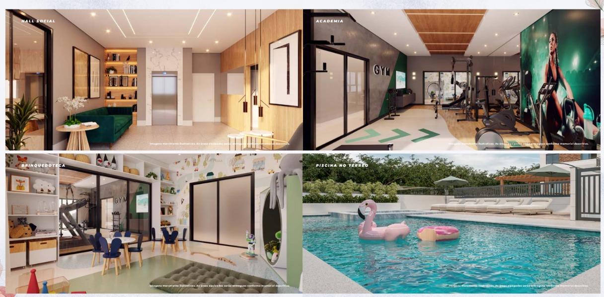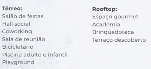 - SALÃO DE FESTAS, COWORKING, SALA DE REUNIÃO, BICICLETÁRIO, PISCINA ADULTO E INFANTIL, PLAYGROUND, PET PLACE, ESPAÇO GOURMET, ACADEMIA, BRINQUEDOTECA.